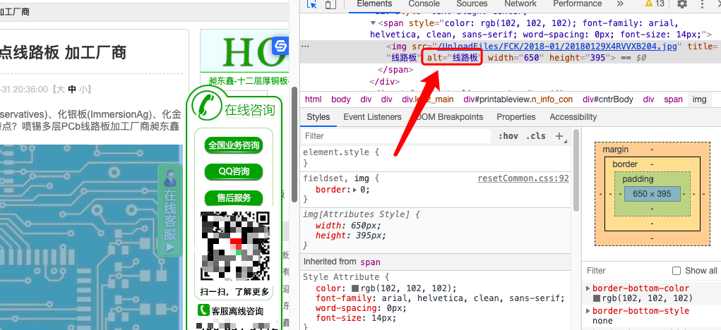 1.2、图片所在网页的周边有相关文字描述,以及图片做了alt标签属性。如上图,图片中加了ALT文字:线路板。查看源代码即如图: